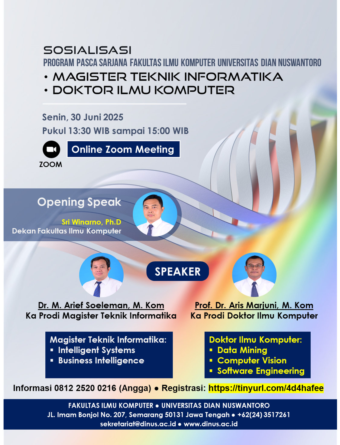 Fakultas Ilmu Komputer Universitas Dian Nuswantoro menyelenggarakan Websinar Sosialisasi Program Pascasarjana bagi calon mahasiswa yang berminat untuk mendapatkan informasi tentang program studi S2 & S3 di Fakultas Ilmu Komputer Universitas Dian Nuswantoro